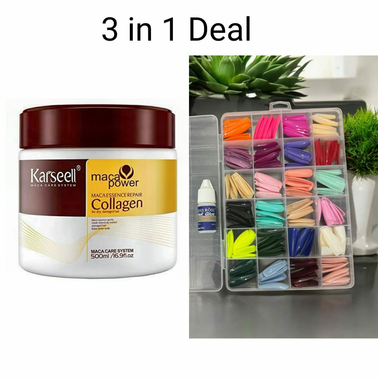 • 3 in 1 Deal Karseell Hair Mask Collagen Treatment Cream + Reusable 576 Pcs Fake Nails + Fake Nails Glue | Makeup And Hair Care Deal