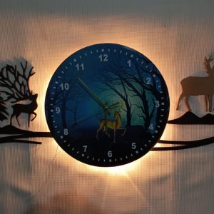 forest figure Deer  3d wood Wall clock blue jungle with light  Fancy Clocks for Bedroom and Drawing Room(with light)