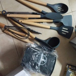 • 12 pcs set Wooden Handle Silicone Kitchen Utensils With Storage Bucket High Temperature Resistant And Non Stick Pot Spatula Spoon( random color )