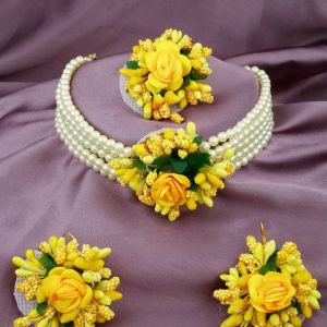• Artificial flower Flower Jewelry Set Pearl  Choker Necklace with Maang Tikka Earrings Floral Handmade perfect for mehndi, mayon, or haldi ceremonies