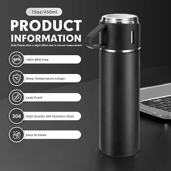 H-409 Vacuum Flask Gift Set with 3 Stainless Steel Cups Combo – 500ml – Keeps HOT/Cold (Random Color)